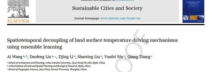 本网讯  近日,安徽建筑大学建筑与规划学院教师在城乡规划领域顶级期刊《Sustainable Cities and Society》(中科院一区Top期刊,2025年影响因子12.0)上发表了题为《Spatiotemporal Decoupling of Land Surface Temperature Driving Mechanisms Using Ensemble Learning》的研究论文。教师王爱为论文第一作者,2023级硕士研究生刘道烽为通讯作者,安徽建筑大学为第一完成单位。
