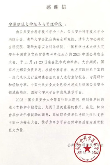 鉴于志愿者团队的出色表现,主办方公共安全科学技术学会特向经管学院发来感谢信。此次活动的成功参与,不仅有力支持了国家级重要会议的顺利举办,也是经管学院践行“立德树人”根本任务、注重培养学生社会实践能力与志愿服务精神的重要体现。(作者:吴雨彤、高沛;一审:孙文;二审:汪令宇;三审:潘和平)