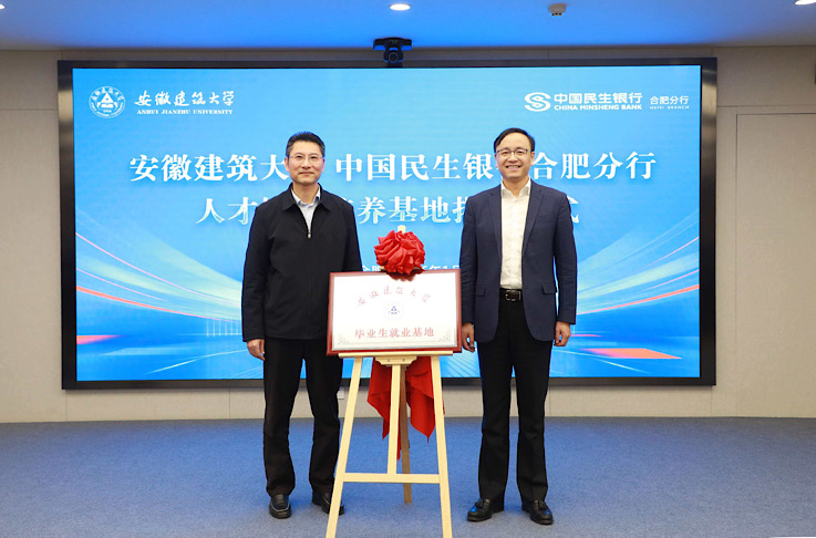 马文革和杨鲲鹏共同为“安徽建筑大学毕业生就业基地”揭牌。
