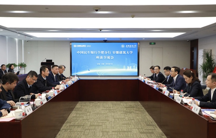 中国民生银行合肥分行党委书记、行长杨鲲鹏热烈欢迎学校一行,介绍了银行的发展历程、业务体系与银校合作情况,表示中国民生银行合肥分行高度重视与安建大的合作,将精准对接学校发展需求,以人才培养和毕业生就业合作为契机,以全周期金融服务赋能学校各项事业发展,打造银校合作共赢的新典范。
