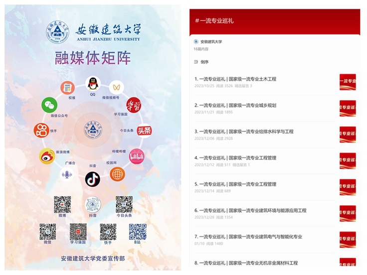 建强媒体矩阵,把握态势。坚持深入贯彻习近平总书记关于加快推动媒体融合发展的重要指示,通过加快构建全媒体传播体系实现“大宣传”格局,在融合发展中巩固壮大主流思想舆论阵地。开展年度二级网站检查评比和宣传思想文化工作队伍业务培训,配齐建强学校网络评论员、网站管理员队伍。强化各级各类媒体内容管理,稳步推进学校网站内容安全及新媒体矩阵建设项目,开通安徽建筑大学视频号,整合“报、台、网、微、端、屏”等媒体资源,推动校园媒体深度融合发展。“十四五”期间累计策划新媒体作品两千余篇(条),阅读量突破百万次,校级新媒体全网关注量超17万人。