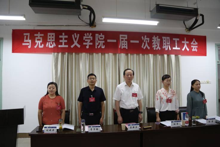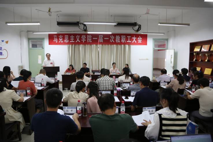 本网讯 9月28日下午,马克思主义学院第一届教职工大会在主教学楼七楼会议室顺利召开。校党委常委、副校长蔡新立出席大会开幕式,校工会主席胡雯、学院党政领导班子和全体教职工共50余人参加会议。