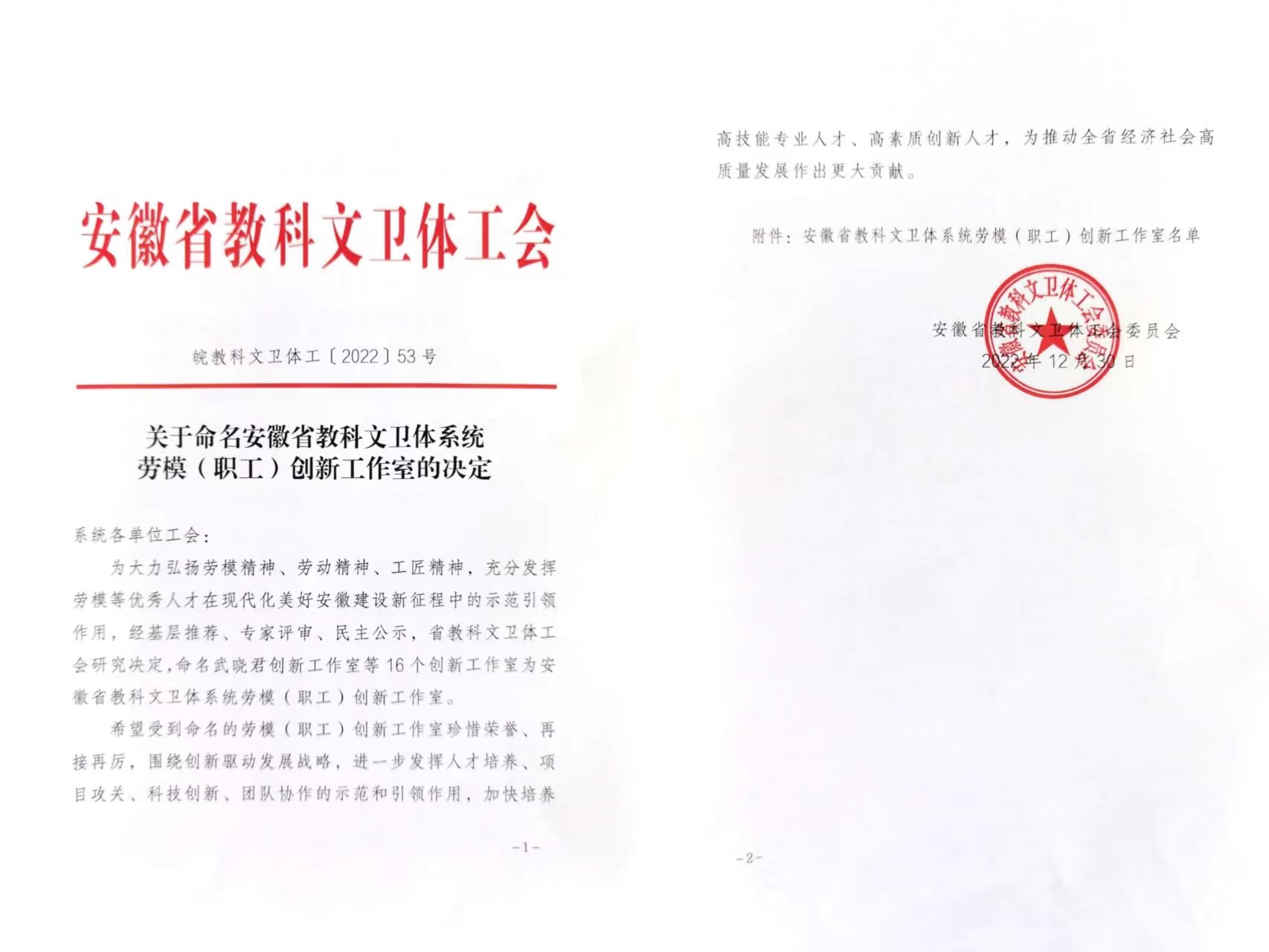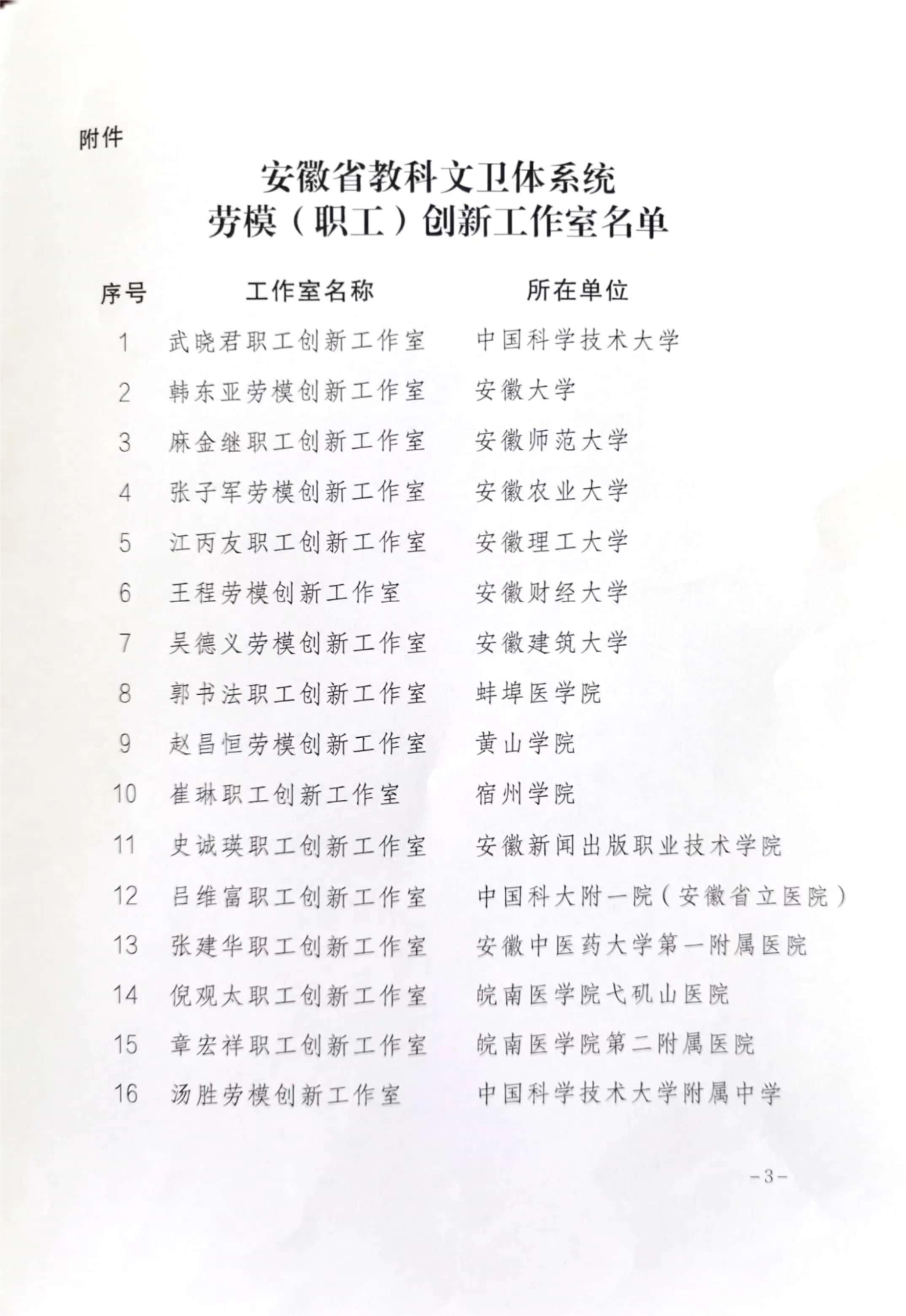 我校获批2022年度安徽省教科文卫体系统 劳模创新工作室