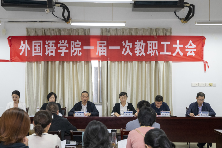 本网讯 10月11日,外国语学院召开第一届教职工大会,校党委常委、副校长闵杰,校工会主席胡雯应邀出席大会,60名学院教职工参加大会。