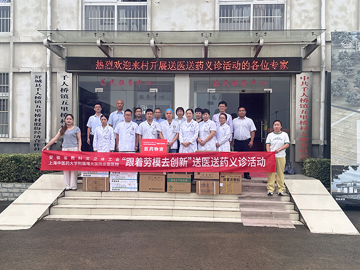 本网讯 9月18日上午,安徽省教科文卫体工会携手上海中医药大学附属曙光医院安徽医院来学校定点帮扶村——舒城县千人桥镇五里桥村开展“跟着劳模去创新”送医送药义诊活动,捐赠价值五万元的药品和医疗设备。省教科文卫体工会副主席、二级调研员李晓燕,上海中医药大学附属曙光医院安徽医院党委组织员翟从永、工会主席江妍妍,校工会以及千人桥镇主要负责同志参加活动。