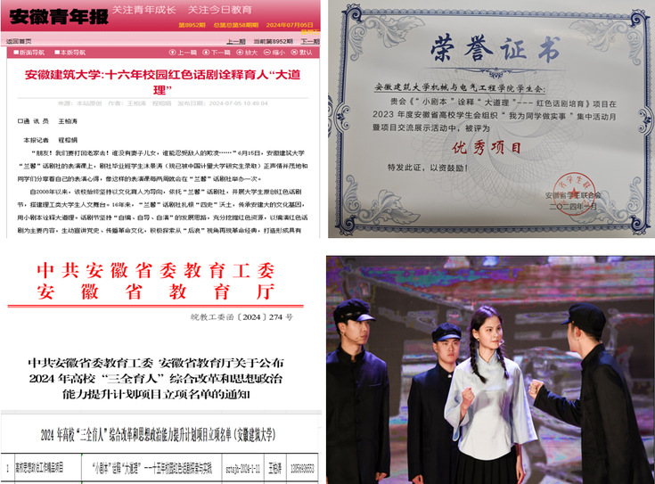 支部坚持把党支部建设成为宣传党的主张、贯彻党的决定、引领广大学生“听党话、跟党走”的坚强阵地。立足“以文化人,以德润心,科学与人文共融,创新与传承并存”的育人思路,依托“兰馨”话剧社,十六年薪火传承,不断擦亮“话剧节”特色活动品牌。深入挖掘红色资源,打造“青年解读、青年演绎、青年影响”的党史宣讲模式,用红色话剧“小舞台”搭建思政“大课堂”,为大学文化注入新内涵、为美育工作增加新层次、为思政教育提升新境界。2024年7月,红色话剧实践活动被《安徽青年报》报道;《“小剧本”诠释“大道理”——十五年校园红色话剧探索与实践》获安徽省“三全育人”综合改革和思想政治能力提升计划项目高校思想政治工作精品项目立项,原创话剧《青春的选择》被《中安在线》报道。