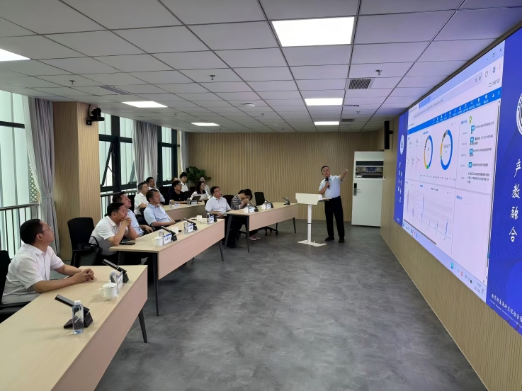 随后,刘业勋主持座谈会。王佐才报告总体建设情况,他表示,接到任务后,学校高度重视,第一时间成立由校党委、行政主要领导担任组长,分管校领导为副组长、办公室(党办、校办)、财务处、人事处、国有资产管理处、后勤管理处、信息网络中心、科技成果转化处为成员的领导小组,构建起“校级统筹、部门协同、专班落实、全程督办”的工作机制。高跃峰详细表述了针对建设时间紧、任务重的紧迫问题,学校在人员选配、空间规划、招标采购和后勤保障等方面超常规支持举措。中心建设专班汇报了中心的一期建设成效和二期建设规划。