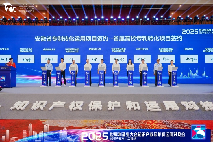 本网讯 9月21日,由安徽省人民政府主办、省市场监督管理局承办的2025世界制造业大会知识产权保护和运用对接会在合肥召开。对接会深度聚焦安徽省十大新兴产业和未来产业,汇聚国内外制造业和科技型龙头企业、顶尖高校和研究机构等多方资源,搭建成果转化对接与合作平台。同时,“以会聚智”,通过院士讲坛、主旨演讲等多样形式,探索知识产权与人工智能深度融合新路径,多维度展示安徽省作为第二批国家专利转化专项计划实施省份的显著成效。安徽省人民政府副省长李中、世界知识产权组织中国办事处高级顾问白光清、国家知识产权局副局长张志成先后致辞,中国工程院院士俞汉青教授作专题报告。校党委常委、副校长王佐才代表学校受邀出席会议并代表学校上台签约,科技成果转化处相关人员陪同参会。