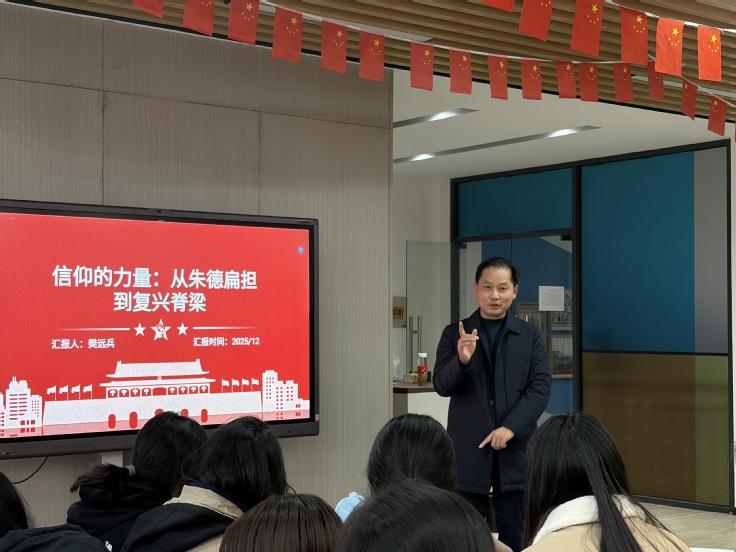 12月12日下午,在学校“一站式”学生社区,黄多能一行全程参与外国语学院主题班会--《信仰的力量:从朱德扁担到复兴脊梁》。外国语学院专职辅导员樊远兵以“朱德扁担”等红色经典故事为切入点,系统阐释中国共产党人坚定信仰、艰苦奋斗的精神内涵,并紧密结合新时代青年的使命担当,引导学生在历史回望与现实思考中深刻体悟信仰的深层力量。黄多能对此次班会的育人成效给予高度评价,他勉励同学们坚定理想信念,将个人追求深度融入民族复兴的时代进程,在实践磨砺中锤炼过硬本领,以实际行动诠释青年担当。