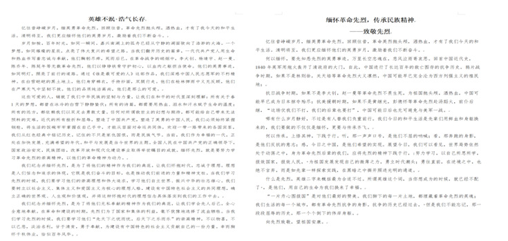 本次征文活动得到了同学们的广泛关注和积极参与。来自各专业的参赛同学们以独特的视角和生动的笔触讲述了一个个感人至深的故事,展现英雄先烈无私奉献的崇高精神。参赛作品不仅表达了对先烈的敬仰之情,更激发了读者们的爱国热情。