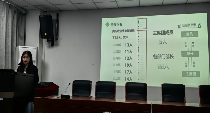 活动中,首先由学生会主席团进行述职,他们就各自负责的工作进行了详细的梳理。他们通过生动的故事、详实的数据和深刻的反思,展示了过去一年中的工作成果和面临的挑战。