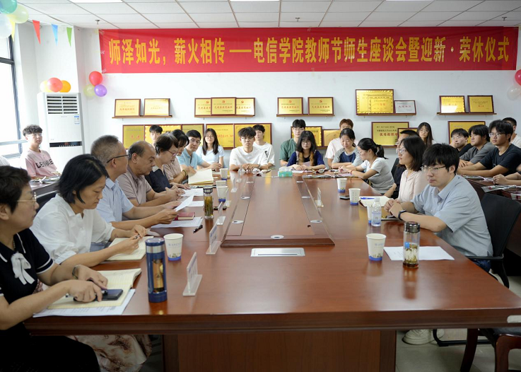 为进一步弘扬尊师重教风尚,传承学院优良教育传统,9月10日上午,电信学院在院会议室举办 “师泽如光,薪火相传 —— 电信学院教师节座谈会暨迎新・荣休仪式”。学院领导班子、荣休教师周原、新进博士教师杜洪梅、王全余、陈梓华,以及学院部分教师代表、学生代表共同参加了此次活动。