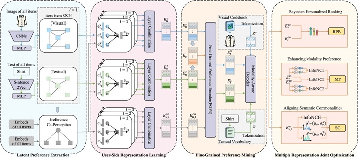 为了解决这一难题,该文提出了一种名为USER(User-Side modality representation Enhancement for multimodal Recommendation,即用于多模态推荐的用户侧模态表示增强)的新颖框架。具体而言,该方法构建了一个统一的跨模态偏好表示,以捕捉用户在跨模态间的共同感知行为。在此基础上,提出了一个细粒度偏好挖掘模块,该模块能够提取用户的细粒度偏好,并在词元(Token)级别上为每个模态选择性地强调最相关的偏好因子,从而将统一的跨模态偏好表示精炼得更具区分性和模态感知能力。