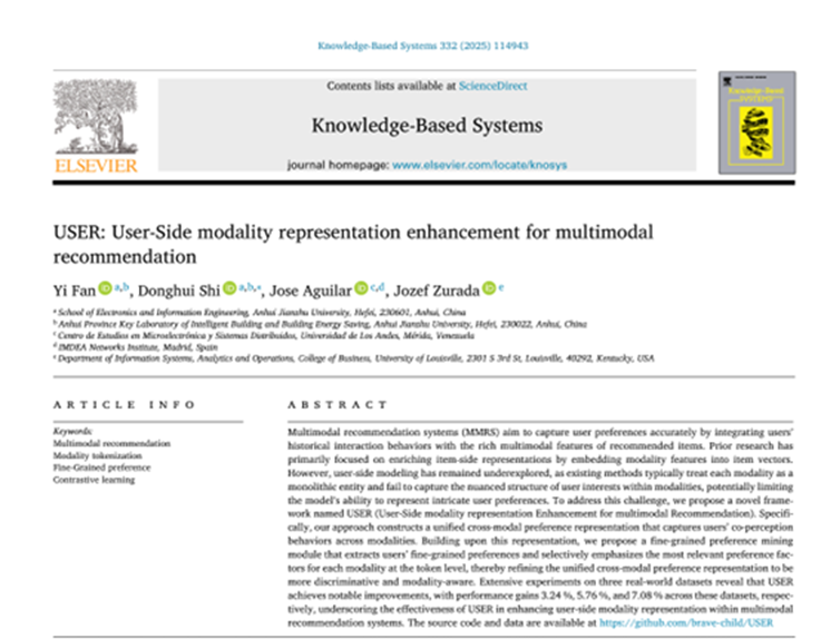 本网讯 近日,电信学院23级节能工程与楼宇智能化专业研究生凡毅作为第一作者在《Knowledge-Based Systems》(KBS)上发表题为“USER: User-Side modality representation enhancement for multimodal recommendation”的学术论文。史东辉教授为通讯作者,安徽建筑大学为第一单位。《KBS》是由Elsevier集团出版的计算机科学、人工智能领域国际权威期刊,2025年影响因子为7.6,中科院SCI一区TOP期刊。