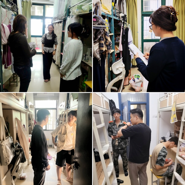 开展宿舍安全检查,消除隐患筑牢屏障。9月29日,学院组织全体专兼职辅导员分组开展“全覆盖、无死角”宿舍卫生安全大检查。检查过程中,辅导员重点围绕宿舍用电安全、消防安全、卫生环境等方面细致排查。针对排查发现的问题,辅导员现场明确整改要求,同步向学生讲解违规用电、消防安全的重要性,提醒离校学生务必关闭水电、锁好门窗、妥善保管贵重物品;留校学生须服从住宿安排,严格遵守用电规定,严禁使用大功率电器、私拉乱接线路,严禁在宿舍存放电动车电瓶或违规充电,切实将安全隐患消除在萌芽状态。