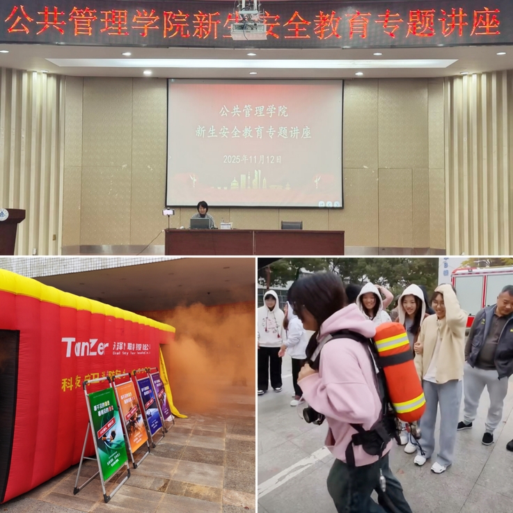 培育安全意识,筑牢成长防线。安全是成长的底线,意识是安全的前提。学院以加强新生安全教育为目标,搭建“理论讲解+实操演练+情景模拟”的立体化教育体系,助力新生筑牢安全防范防线。活动中,学院党委副书记江侠结合高校安全典型案例与学院实际情况,从宿舍安全、人身安全等多个关键维度展开细致讲解,既为新生普及必备安全知识,也进一步强化其风险防范意识。组织新生参加校消防安全演练,消防器械展示区里,灭火器、消防水带、灭火毯整齐排列;教官现场手把手教学灭火器使用技巧,耐心指导每一位新生掌握实操要领;仿真火场模拟屋内浓烟弥漫、光线昏暗,高度还原真实火灾场景,让在场新生直观感受火灾的危险性,深刻认识到掌握逃生技能的重要性。