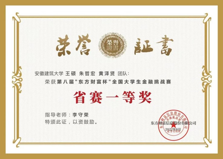 本网讯 近日,第八届“东方财富杯”全国大学生金融挑战赛省赛落下帷幕。经管学院李守荣博士精心指导,经管学子朱哲宏、王硕、黄泽贤组成的团队经过三个月的激烈比拼,从全省六千多支代表队中脱颖而出,荣获省赛一等奖。