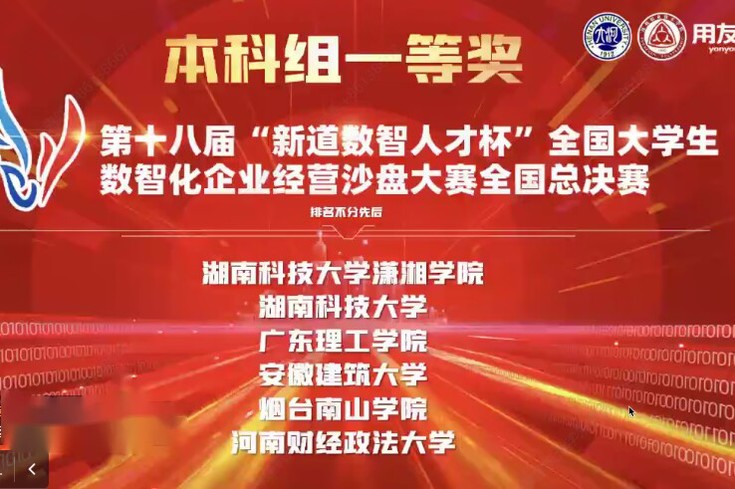 本网讯 2022年11月5日,第十八届“新道数智人才杯”全国大学生数智化企业经营沙盘大赛总决赛落下帷幕。经管学院韦建康、刘伟、卞晓倩、赵启赞组建的团队在朱素媛老师的精心指导下,与北京航空航天大学、苏州大学、贵州大学等高校同台竞争,从来自全国30个省(市)高校的143支参加总决赛的队伍中脱颖而出,荣获全国总决赛一等奖!