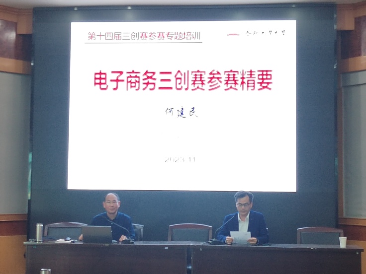 培训会上,何建民教授分别从三创赛及其参赛要求、参赛项目选题与培育、团队组建与作品打磨、项目路演与评审要义四个方面介绍了电子商务三创赛的参赛精要,为参赛选手提供了全方位的指导。培训会现场气氛热烈,参会学生们纷纷表示通过参加此次培训活动,不仅对三创赛有了更为深刻的理解,也学到了许多实用的创新方法和技巧,切实提高了参赛信心。