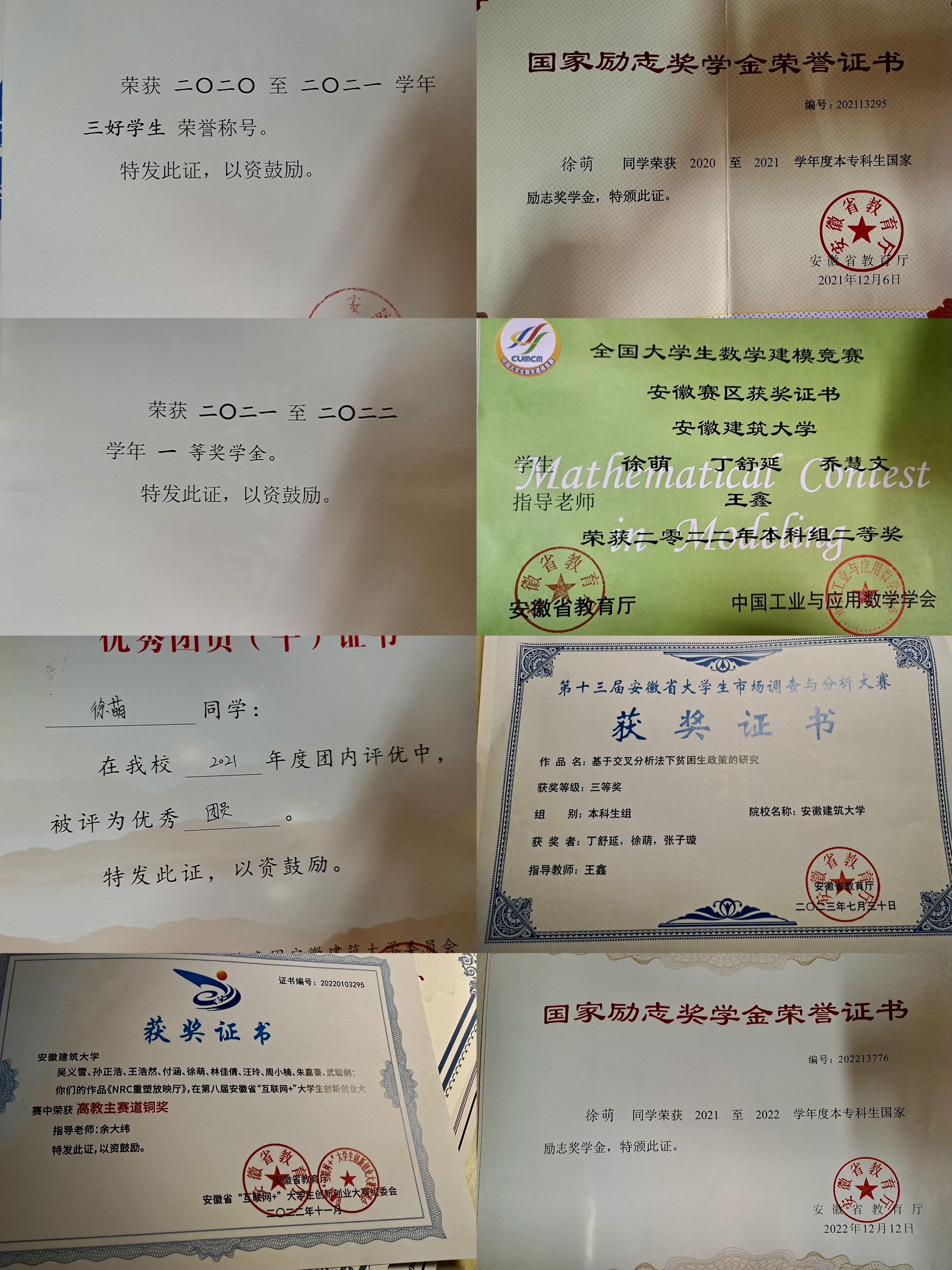 理想的风会吹进现实,熬过的夜也会变成光。在课余时间,徐萌同学为了充实生活,全面发展,积极参加各类学科竞赛和创新创业类的比赛,先后荣获“互联网+”创新创业大赛高教主赛道铜奖,安徽省金融投资创新大赛省级二等奖,主持大学生创新创业训练计划省级项目并成功立项。在刚接触到这些比赛时,她也和大家一样,不知所措,慢慢地,在老师的指导下,朝着目标一步一个脚印,最终看到了胜利的曙光。徐萌表示,这些丰富的比赛经历让她在遇到挫折和挑战时能够从容不迫,她坚信只要踏实去做,就一定会有收获。