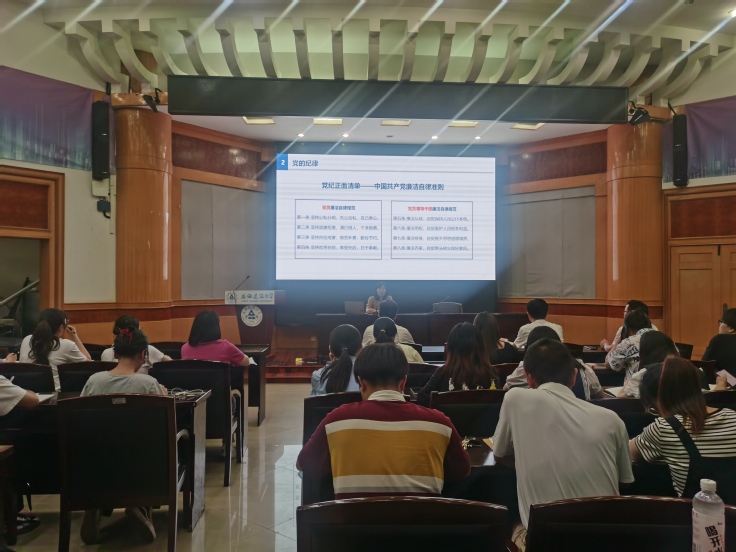 帅英以《学条例守党纪强党性》为题,从党的规矩是什么、党的纪律有哪些及准确把握新修订《条例》的主要内容三个方面进行了阐述和讲解,通过结合典型的警示案例,深入浅出地阐释了《条例》所蕴含的核心要义、基本精神和丰富实践要求,为全体师生党员准确领会和贯彻落实《条例》提供了有益指导。