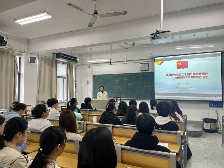 本网讯 为深入学习贯彻党的二十届三中全会精神,用党的最新理论武装头脑,更好地用全会精神统一支部思想、凝聚支部共识,充分发挥基层党组织战斗堡垒作用。近日,经管学院组织学生第五党支部、学生第六党支部和学生第八党支部学生党员、入党积极分子开展学习贯彻党的二十届三中全会精神宣讲。宣讲会由学院学习宣传贯彻党的二十届三中全会精神师生宣讲团成员宁宁老师主讲。