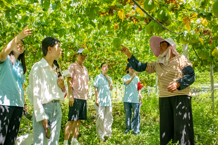 在三江村葡萄大棚和瓜篓子基地的实地参观中,实践团深刻感受到了乡村文化的坚韧与温暖。瓜篓子基地创始人向师生们详细讲述了自己当年毅然返乡开荒、吸引资金,到精心种植、迎来成熟收获的艰辛历程。在种植过程中,基地坚持采用滴灌技术与人工除草相结合的方式,以生态环保的种植模式保障瓜篓品质。此外,基地还积极承担社会责任,为当地留乡老人提供工作岗位,帮助老人们解决基本生活开销问题,让村民们在获得经济收入的同时,也能感受到集体的温暖和关怀。