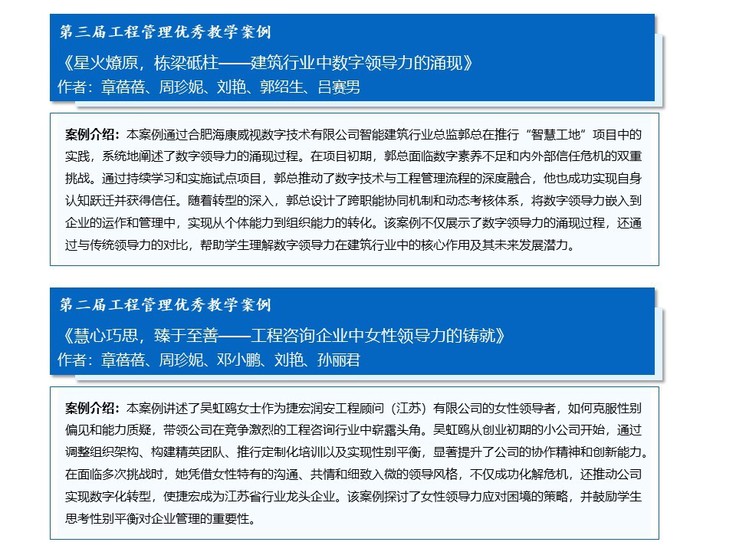 该团队获奖的优秀教学案例均是MEM师生联合企业共同开发的原创案例。其中,案例《星火燎原,栋梁砥柱——建筑行业中数字领导力的涌现》是与合肥海康威视数字技术有限公司联合开发,案例《慧心巧思,臻于至善——工程咨询企业中女性领导力的铸就》是与捷宏润安工程顾问(江苏)有限公司联合开发。两个案例聚焦于工程管理领域中领导力塑造问题,揭示了卓越领导者如何驾驭技术变革、融合多元智慧以应对复杂工程挑战,深刻回应了新时代工程管理(MEM)人才的核心诉求,为我们的教学提供了鲜活的本土实践与理论镜鉴。