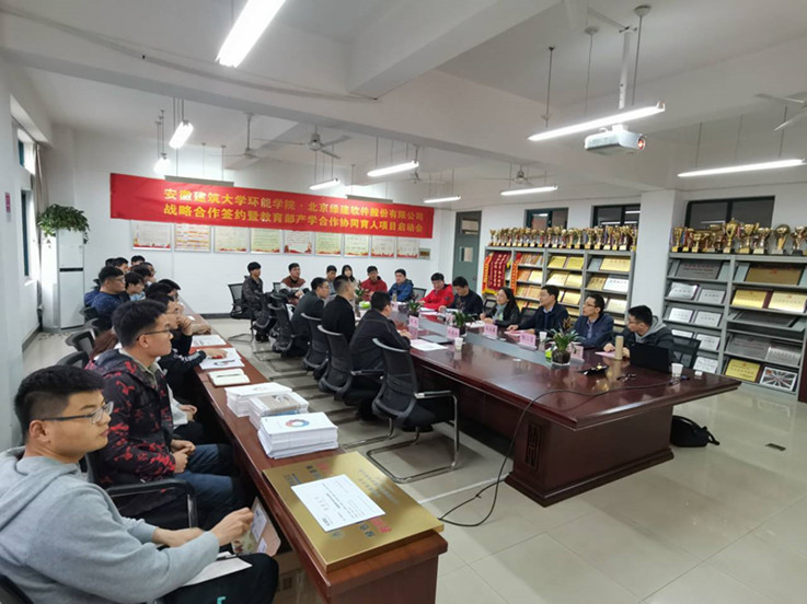 此次合作主要依托“教育部2020年第一批产学合作协同育人项目”(高教司函〔2021〕3号),并基于校企双方在绿色建筑技术、BIM技术、模拟仿真技术以及教学基地和科研平台等方面的优势建立校企战略合作关系。会议由副院长解华明主持,首先由王媛书记致欢迎辞,解华明副院长介绍了学校及学院建设概况,陈成副总经理介绍了企业核心技术、主要软件平台以及市场应用情况;胡浩威主任作为项目负责人汇报了我校承担的“基于BIM技术的绿色建筑实践平台建设与应用研究”教育部产学合作协同育人项目情况;随后,王媛书记和陈成副总经理分别代表安徽建筑大学环能学院和北京绿建软件股份有限公司共同签署了战略合作协议,并为教育部产学合作协同育人项目揭牌。最后,陈成副总经理和任建彬工程师分别以“绿色建筑模拟技术教育应用”和“绿色建筑概论及模拟技术”为主题进行了专题报告,并与教师、研究生代表展开了深入交流。