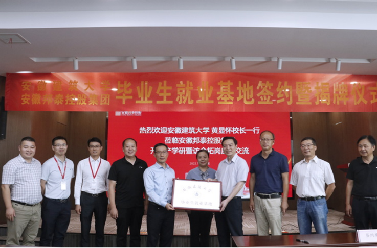 会后,校就业工作处处长魏东和安徽邦泰控股集团人力行政中心总经理周春阳代表校企双方签定了毕业生就业基地协议书,黄显怀与陈齐共同为安徽建筑大学毕业生就业基地揭牌。(作者:水滔滔;审稿:谢发之)