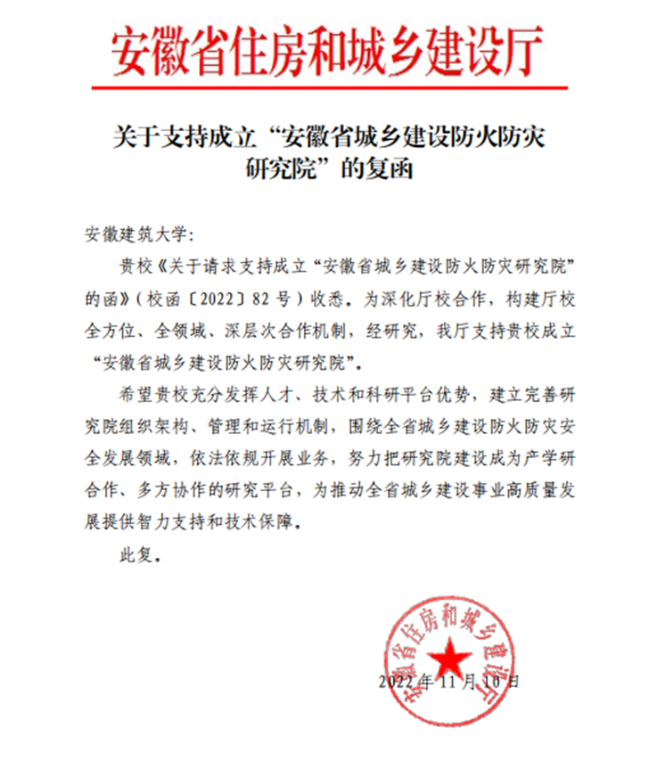 本网讯 近日,安徽省住房和城乡建设厅复函我校,正式批准我校成立“安徽省城乡建设防火防灾研究院”。