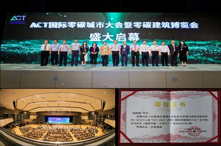 本网讯 6月28日至30日,“ACT 2023(首届)国际零碳城市大会暨零碳建筑博览会”在北京召开。会议由中国建筑节能协会、中联慕尼(北京)国际会展有限公司主办,中国建筑集团有限公司、中国建筑科学研究院有限公司、中国建设科技集团股份有限公司联合主办,C40城市气候领导联盟、儿童投资基金会、德国伍珀塔尔气候环境能源研究所等7家国际合作机构及众多国内各地主管部门与企业协办。我校环能学院胡浩威副教授带领4名研究生参加了本次会议,参会论文《合肥地区窗墙比对动态自然通风能耗的影响研究》得到高度认可,入选“ACT 2023(首届)国际零碳城市大会”论文集并推荐刊发于《建筑节能(中英文)》期刊。