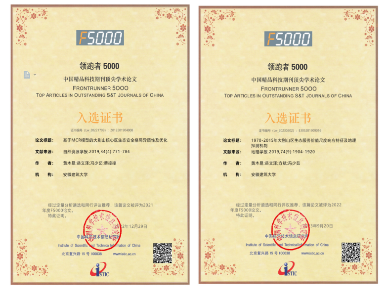 本网讯 我院资源科学系黄木易教授团队和南京师范大学方斌教授、浙江大学岳文泽教授合作发表在《自然资源学报》与《地理学报》上的论文,分别被中国科学技术信息研究所评为2021年度、2022年度“领跑者5000—中国精品科技期刊顶尖学术论文(F5000)”。其中,“基于MCR模型的大别山核心区生态安全格局异质性及优化”发表在2019年的《自然资源学报》(第34卷第4期)上,目前,据不完全统计该文下载量已达3500余次,引用率160余次;“1970-2015年大别山区生态服务价值尺度响应特征及地理探测机制”发表在2019年的《地理学报》(第2019年第74卷第9期)上,据不完全统计,论文下载量已达5000余次,引用率150余次。