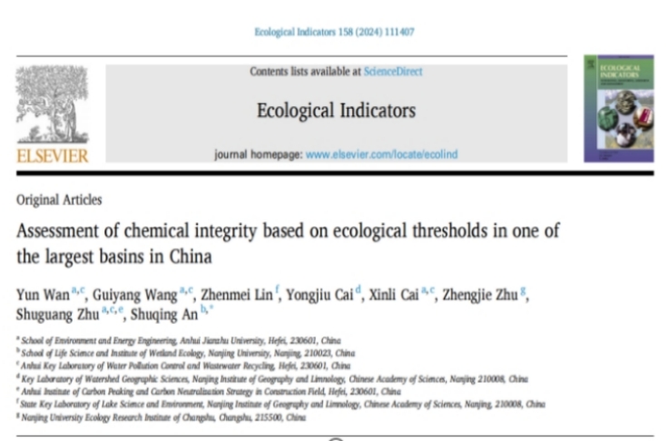 本网讯 环境与能源工程学院万云老师和硕士生王贵洋与南京大学安树青教授、中科院南京地理与湖泊研究所蔡永久研究员合作在环境领域Top期刊《ECOLOGICAL INDICATORS》 (JCR1区,影响因子6.9)在线发表了题为“Assessment of chemical integrity based on ecological thresholds in one of the largest basins in China”的研究论文,安徽建筑大学为第一完成单位。
