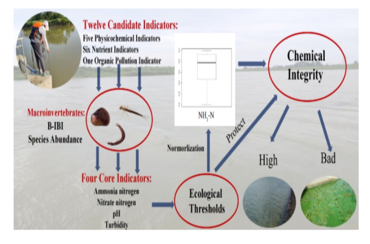 化学完整性对维持水生生态系统的生态完整性至关重要。尽管生态完整性评估意义重大,但往往优先考虑生物完整性评价,导致对化学完整性评价存在不足。此外,尚未建立一个完整的化学完整性评估框架。为了解决以上问题,课题组通过指标的筛选、指标归一化和指标赋权建立了一个新的化学完整性评估框架。结合指示物种阈值分析(TITAN)和皮尔逊相关分析,确定了主要的评价指标,并确定了对应的物种群落阈值。将获得的群落阈值应用于改进归一化方法,评价指标的权重由对应的指示物种的数量确定。该评估框架被应用于淮河流域的化学完整性评估。