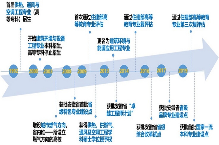 安徽建筑大学是安徽省最早创办建筑环境与能源应用工程专业的院校之一,1992年开始首届供热、通风与空调工程专业招生;2003年,抓住安徽省燃气工程发展的机遇,增设了城市燃气方向,成为省内唯一一所设立燃气方向的高校;2008年专业被评为安徽省首批省级特色专业建设点;2009年专业通过住建部高等教育建筑环境与设备工程专业评估,同年,获得供热、供燃气、通风及空调工程学科硕士学位授予权;2013年被列为安徽省省级卓越工程师计划专业;2014年专业通过住建部专业教育复评估;2016和2017年分别被列为安徽省省级综合改革试点和省级品牌专业建设点;2019年通过住建部高等教育专业第三次复评估,同年入选首批国家级一流专业建设点。