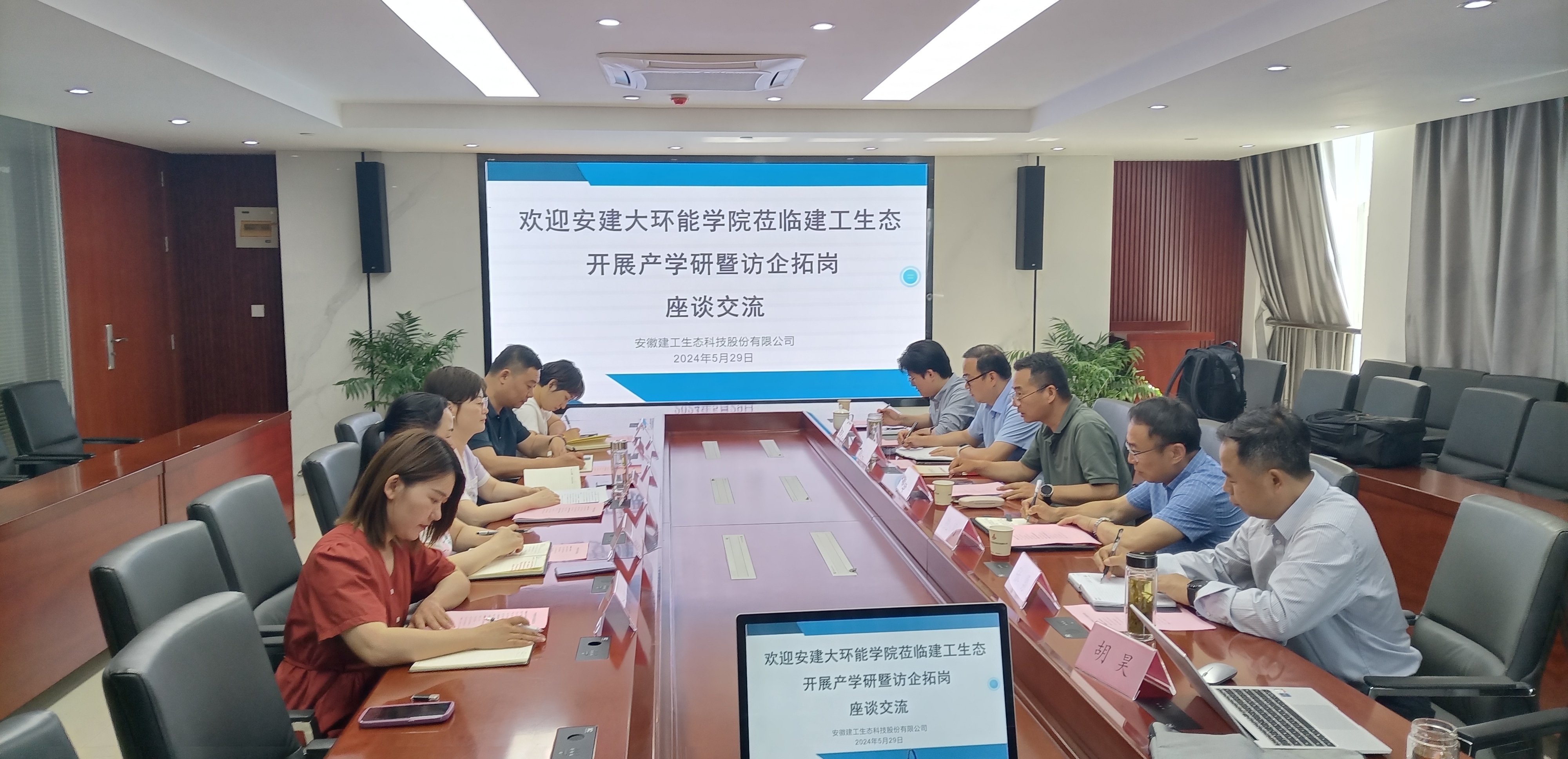 安徽建工生态科技股份有限公司总经理蔡祥杏、南京天加环境科技有限公司制造体系商用厂厂长陈小康、南京华创环境技术研究院有限公司总经理梁英热情接待环能学院一行。分别介绍公司的业务范围、工程项目、技术研发和人才需求,希望能够进一步提升与学院合作层次、挖掘合作潜力,畅通人才供需渠道,实现共同发展。