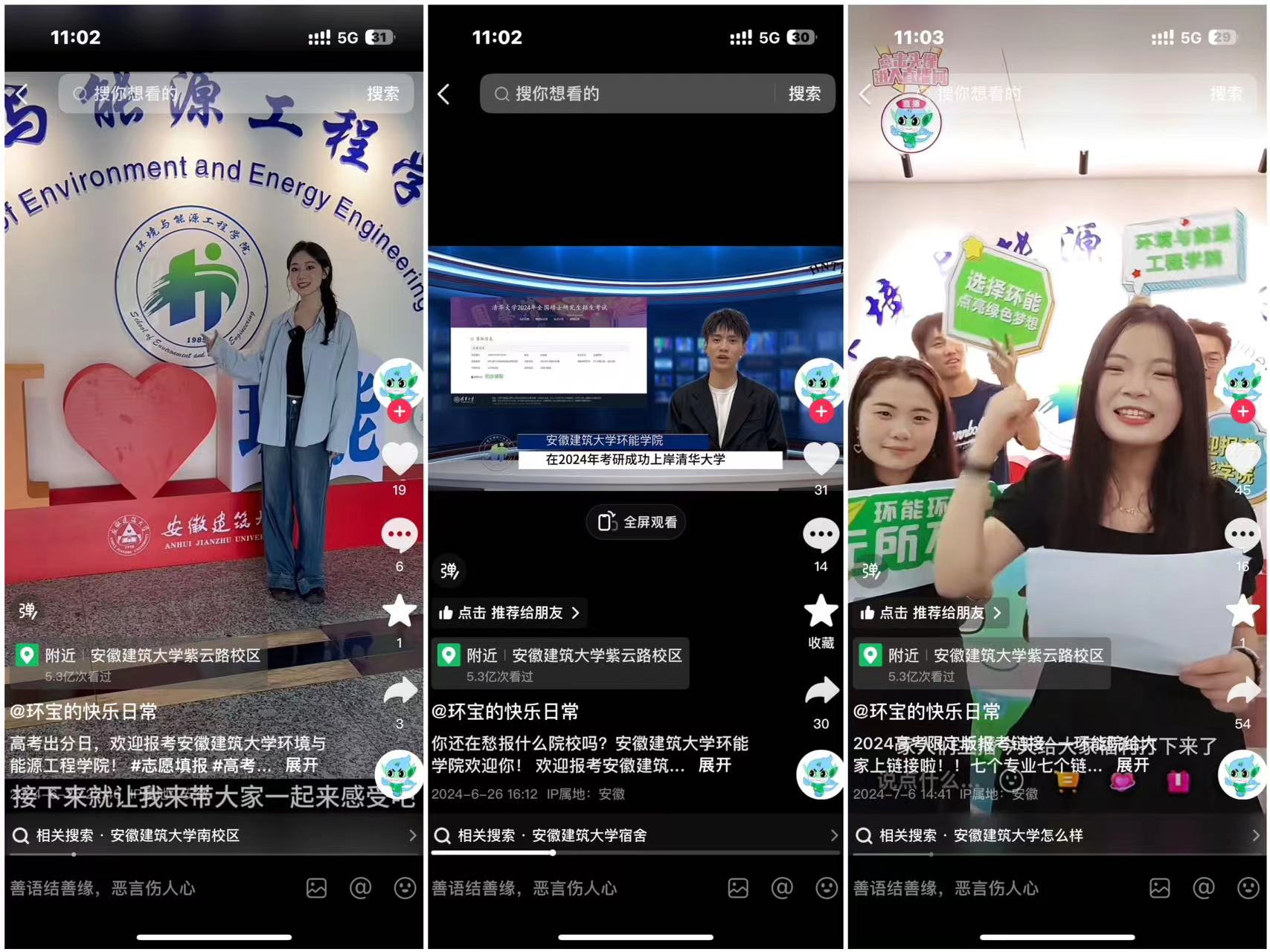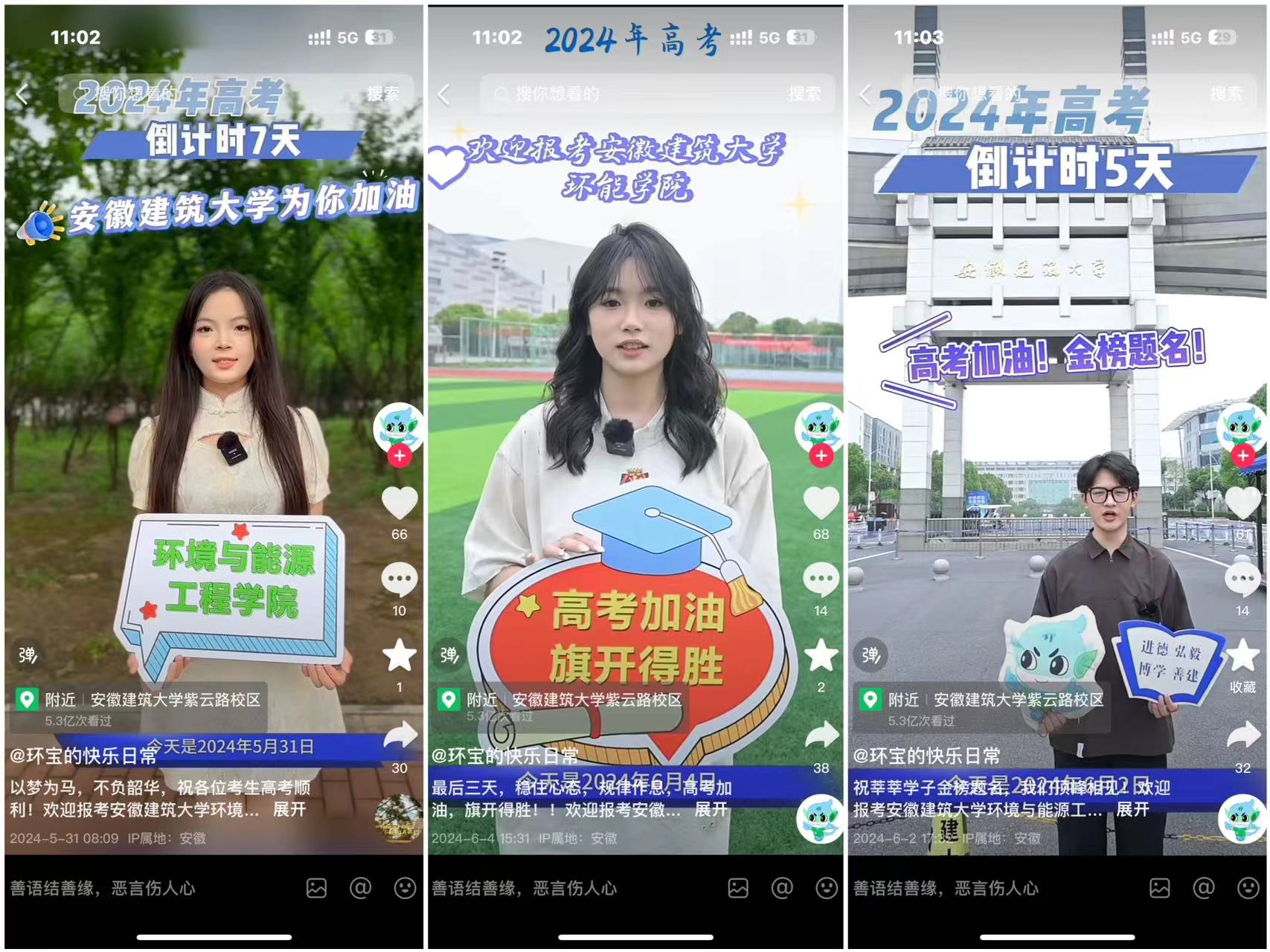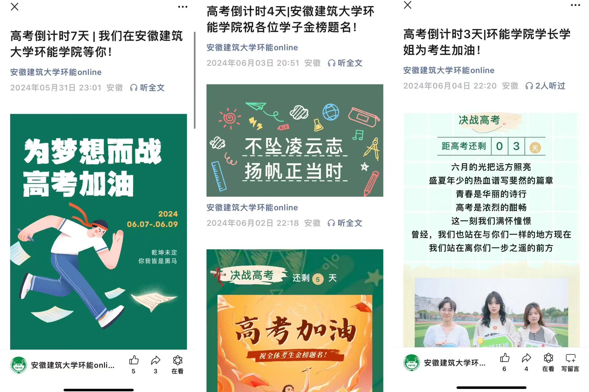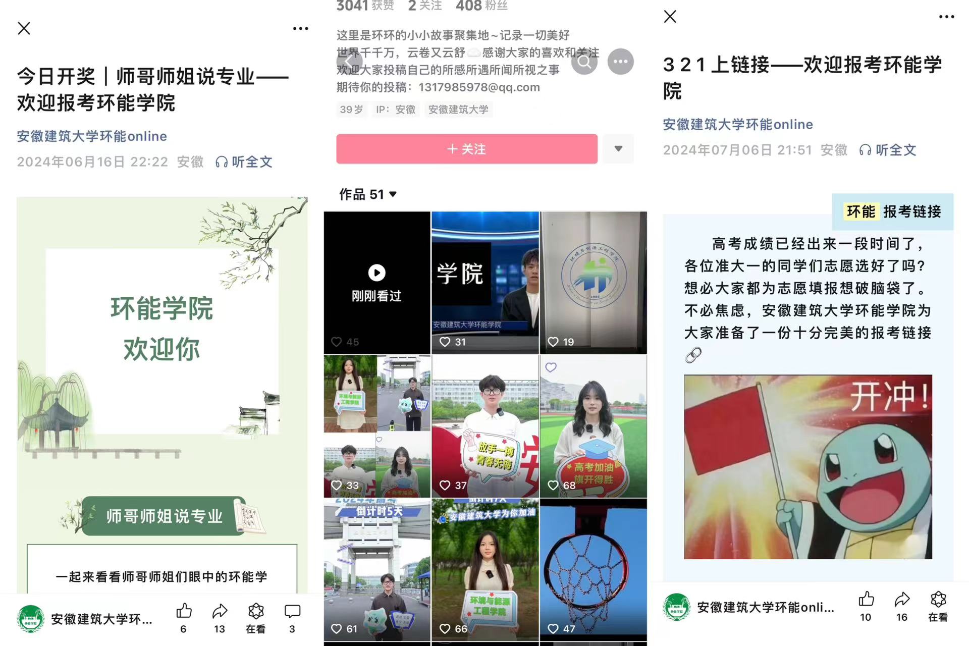 高考前后与志愿报考期间,学院充分发挥网络平台阵地优势,扩大招生传播力度,利用学院官方微信公众号“安徽建筑大学环能online”与抖音“环宝的快乐日常”推送6篇推文、8条视频,在给高考生们加油打气的同时,也对学院专业进行了介绍,让考生及家长多视角地了解学校、学院。招生期间,开通电话专线、组建线上咨询群,提供丰富的线上咨询途经,全天候为广大考生和家长提供详尽的志愿填报参考咨询服务。多元媒体矩阵的构建,营造了良好的招生氛围,帮助广大考生和家长客观、全面地了解学校、学院及专业,切实有效地推动了招生宣传工作的稳步开展。