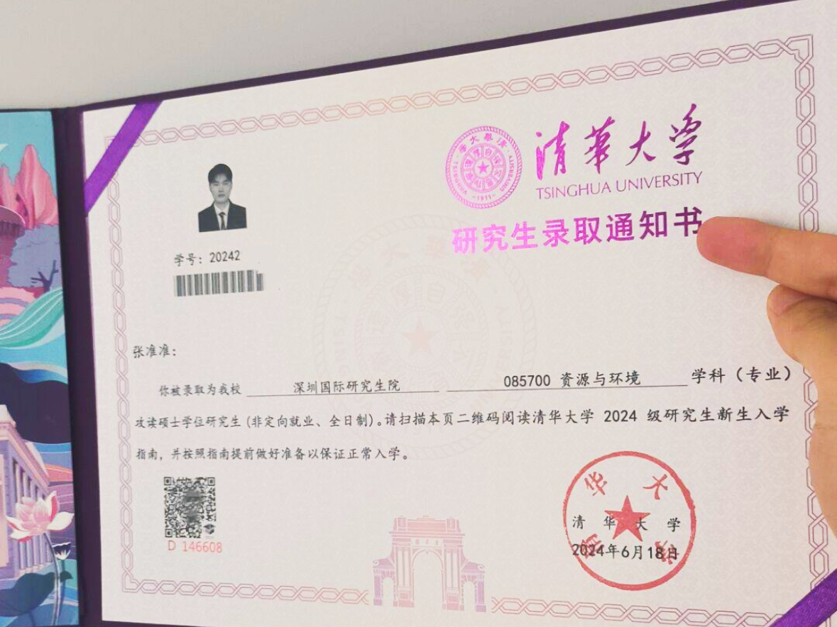 考清华并不是张准准最初的目标,他也曾在各个院校间不断徘徊犹豫,而下定决心报考清华大学是因为给排水的“卷”。“给排水专业很‘卷’,但是是一种良性的‘卷’,正是因为班级里这种比学赶超的氛围,给了我报考清华的勇气”。目标像灯塔一样指引着他考研航行的路线,漫长的考研路上,他也遇见过各种各样的问题,它们或多或少地影响着他的复习状态,但他及时通过与家人朋友聊天、跑步来调整心态,不急于求成、不贪求速度,按部就班、稳步前行,这封清华研究生录取通知书就是对他坚持不懈最好的反馈。