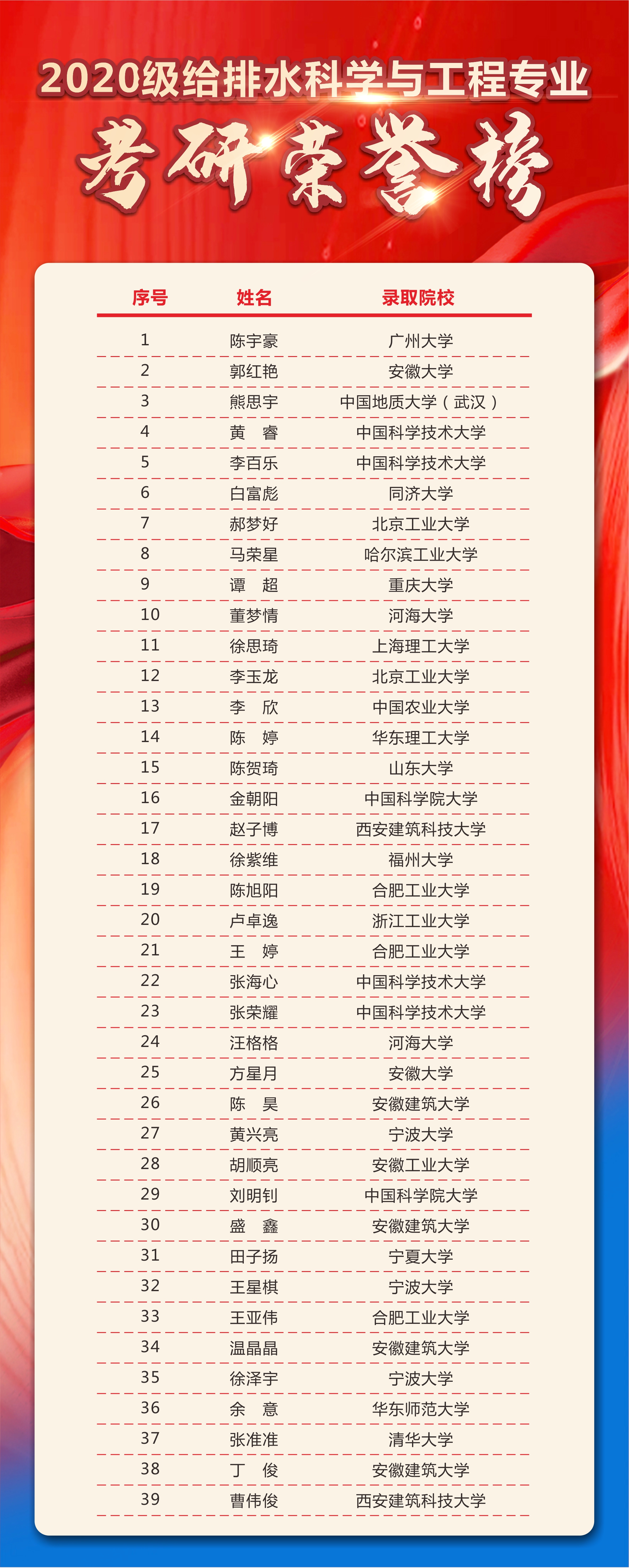 一个人可以走得很快,一群人可以走得更远。张准准所在集体——环能学院2020级给排水科学与工程专业在今年研究生考试中考研录取率达42%,其中,包括张准准在内有11人成功考取清华大学、中国科学技术大学、哈尔滨工业大学等“985”学府,14人成功考取河海大学、合肥工业大学、北京工业大学等“211”院校,两人考取中国科学院大学。