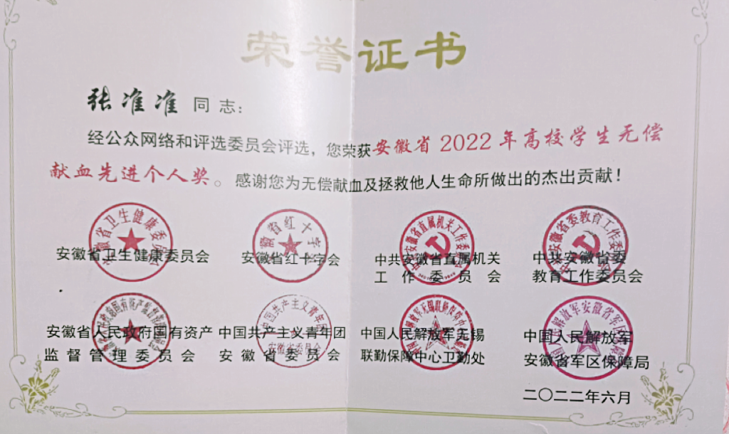 刚步入大学时,张准准就在心里埋下了一个要考研的种子,但那个时候比考研更重要的是:努力学习,转到自己喜欢的专业。大一下学期,他顺利通过考核,成功转入给排水科学与工程专业。“在我看来,给排水是最好的专业,给排水专业的同学看起来也都很自信、很厉害,所以我想加入他们”张准准如实说到。除了认真学好专业课以外,张准准还积极参加各类志愿服务活动,他曾担任校红十字协会会长,大学期间参与过5次无偿献血,荣获“安徽省2022年高校无偿献血先进个人奖”,因在生态保护方面的突出表现,2022年被评为安徽省“百优大学生”。