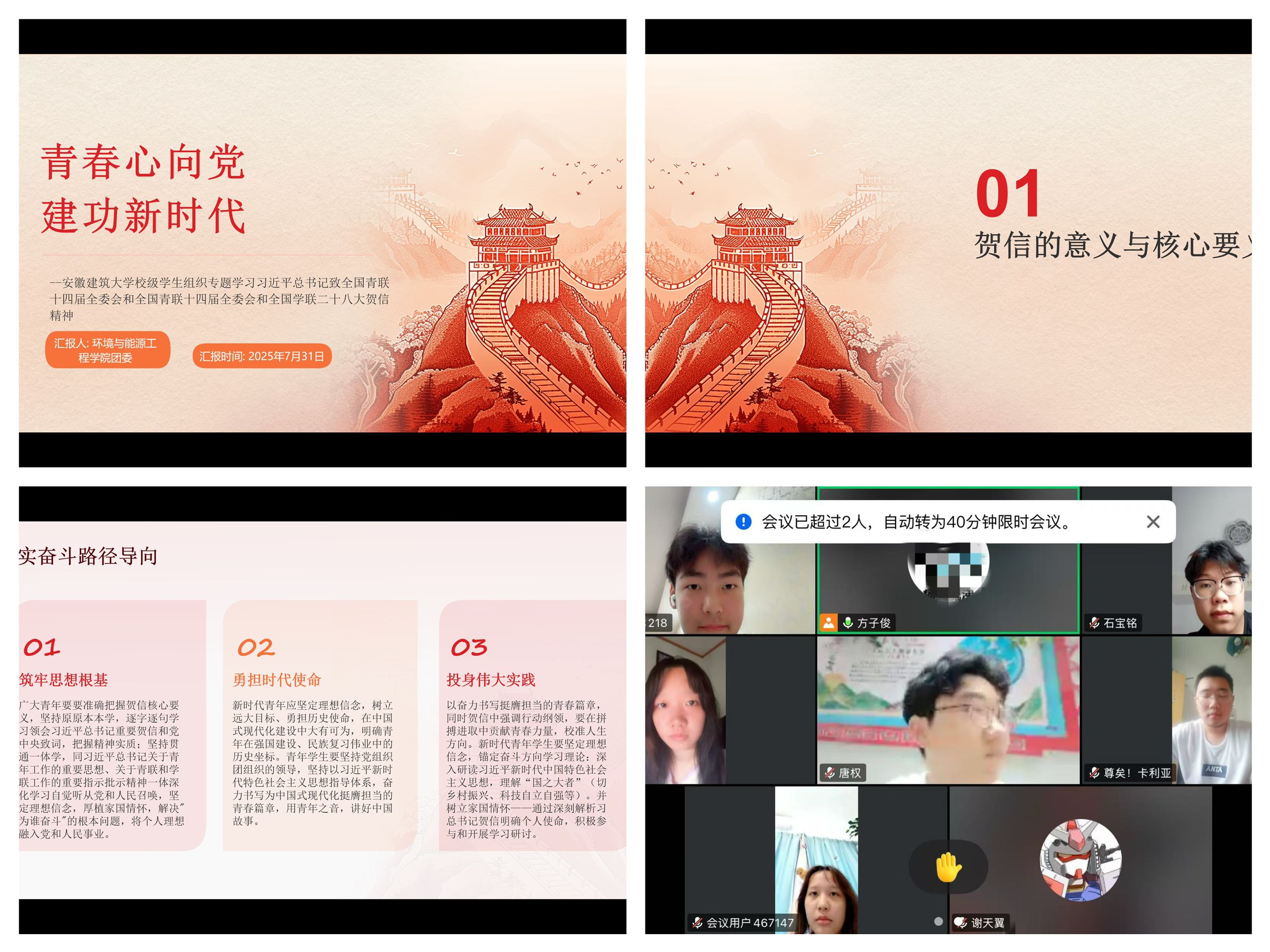 本网讯 为深入学习贯彻习近平总书记致全国青联十四届全委会和全国学联二十八大的重要贺信及党中央致词精神,进一步引导青年学子坚定理想信念、勇担时代使命,7月31日上午,环能学院组织学生通过线上平台开展专题学习活动,迅速掀起学习热潮。