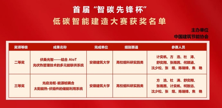 本网讯 近日,由中国建筑节能协会主办的首届“智碳先锋杯”低碳智能建造大赛获奖名单正式公布,环境与能源工程学院师生自主申报的两项科研实践类(高校组)项目荣获大赛二等奖和三等奖各一项,为安徽省唯一获奖的高校组参赛团队。