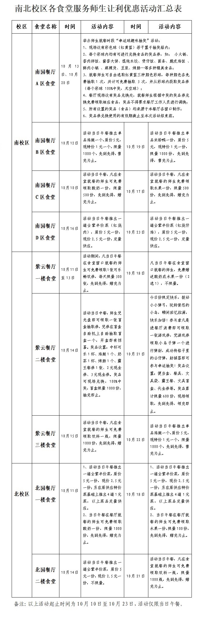 为喜迎党的二十大胜利召开,进一步丰富校园饮食生活,倾情回馈师生,更好地为广大师生提供优质餐饮服务,后勤服务集团在保障全校师生饮食正常供应、安全卫生的前提下,自10月10日至10月23日,在南北校区食堂持续两周开展 “喜迎二十大,美食乐惠购”让利优惠活动,活动时间、地点和活动内容详见下表。