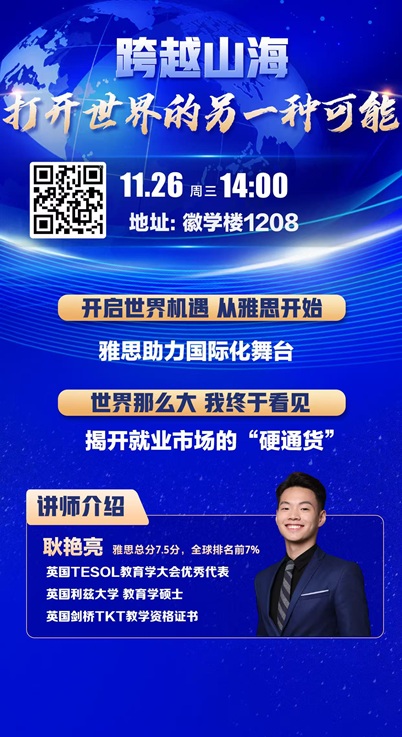 为满足大家雅思、托福备考需求,助力有出国留学及国际交流意向的同学提升语言应试能力、拓宽发展路径,延续11月5日我校第三届国际教育展的国际化服务热度,贴合实际需求、营造浓厚学习氛围,学校国际交流合作处将联合合肥新东方前途出国举办雅思托福备考专题讲座。本次讲座面向全校各学院学生,重点面向有出国意向及语言备考需求的同学。现将具体事宜通知如下: