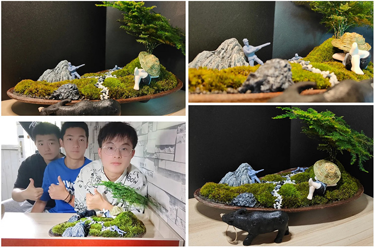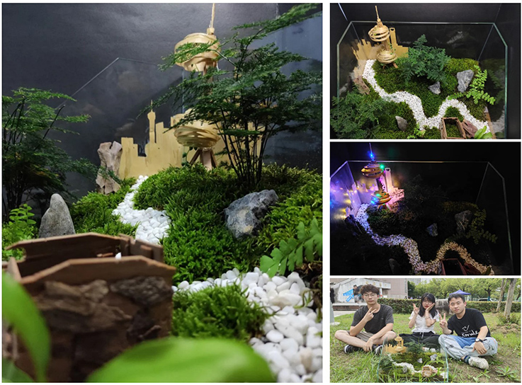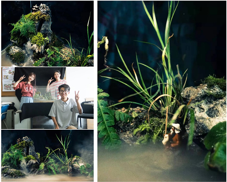 作者心语:本作品以玻璃缸为景观容器,以日常材料作为基层和绿植,构建出一个小型山水景观。此景观正面为一耄耋老翁于茂盛的禾苗之下乘凉垂钓,喻指“禾下乘凉梦”,其身后,嶙峋山石在涓涓流水上升腾起的雾霭中勾勒出朦胧的轮廓,遥望远处峰顶上有凉亭茕茕孑立,营造出一派山水石林意境。本作品以环保材料的组合塑造出一幅“禾下乘凉梦”之景,意在歌颂与缅怀袁老在杂交水稻方面的卓越贡献,吾辈将始终心怀感恩,砥砺前行。