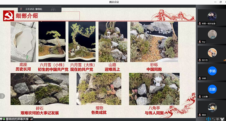 本次微景观大赛共收到有效作品56项,经组委会初选出15项作品进入决赛路演环节,入选作品通过对选题立意、设计构思以及制作过程的汇报,将党史学习成果深刻融入到微景观营造中来。学校、学院相关领导、协办单位以及专业教师、参赛学生近100人参加活动,品鉴者认真聆听,汇报者娓娓道来。