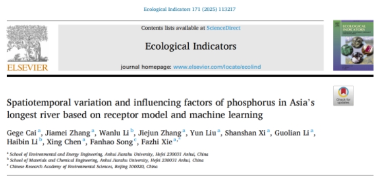 本网讯 近日,我校环境与能源工程学院博士研究生蔡格格同学作为第一作者在环境领域中科院一区TOP期刊《Ecological Indicators》在线发表了题为“Spatiotemporal variation and influencing factors of phosphorus in Asia’slongest river based on receptor model and machine learning”的科研论文,安徽建筑大学环境与能源工程学院为论文的第一完成单位和通讯单位。