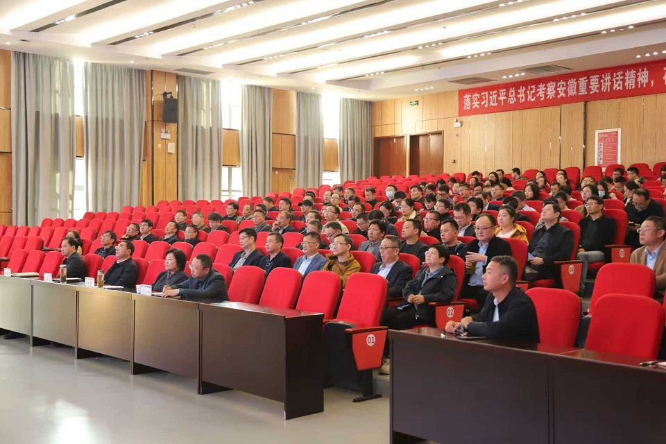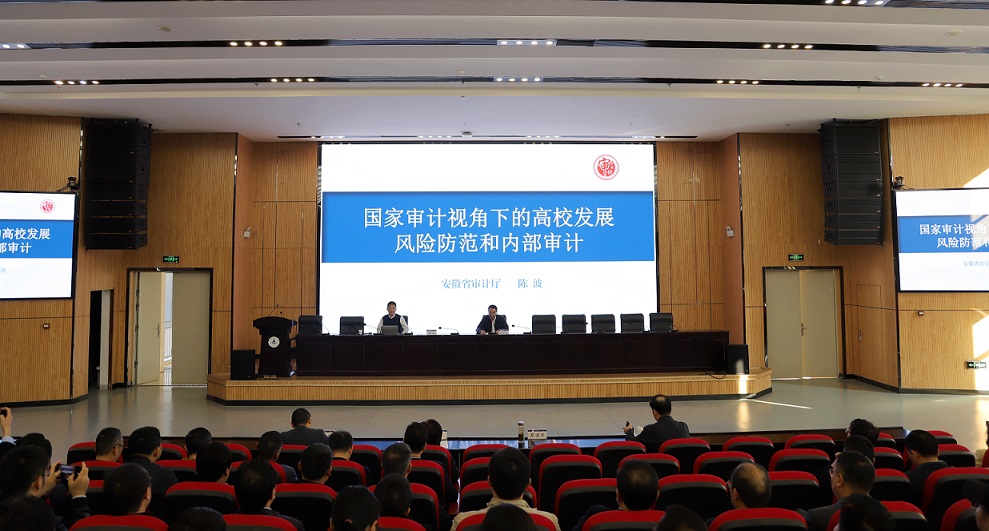 本网讯 11月4日,为深入贯彻落实国家关于审计工作的决策部署,全面提升学校内部治理水平和风险防范能力,学校在紫云路校区徽风楼二楼报告厅举办审计政策法规专题宣讲会。省审计厅科技教育室主任陈波受邀作专题宣讲。校党委副书记、校长蔡国军主持会议并讲话,校领导、学校副处级以上干部及教师代表参加会议。