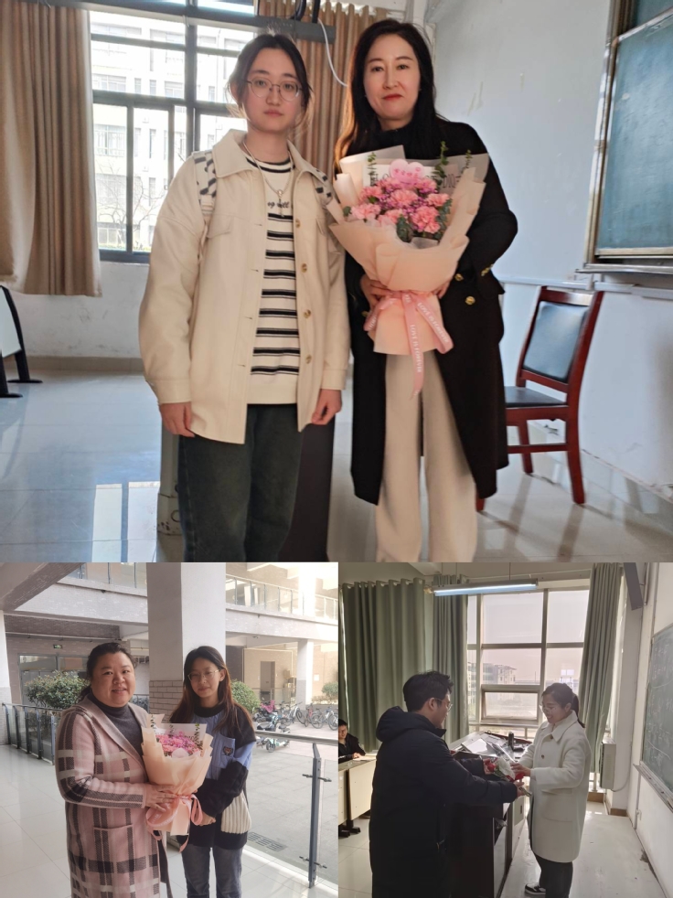 在每一位女老师下课后,学生代表为老师献上美丽的鲜花。在场学生齐声欢呼“老师,节日快乐”,更是让老师们惊喜而感动。每一个教室都充满了和谐、快乐和幸福的气氛。2022级统计学王玉欣说:“老师们真的很辛苦,对我们也很用心,平日里没有机会也不好意思跟她们太亲近,今天班上能以这样简单但温馨的方式来感谢老师,我特别激动,也强烈的感受到了班集体的温暖和团结。”对未在妇女节当天上课的女老师,学院也为她们精挑细选了精致美丽的小盆栽作为节日礼物。